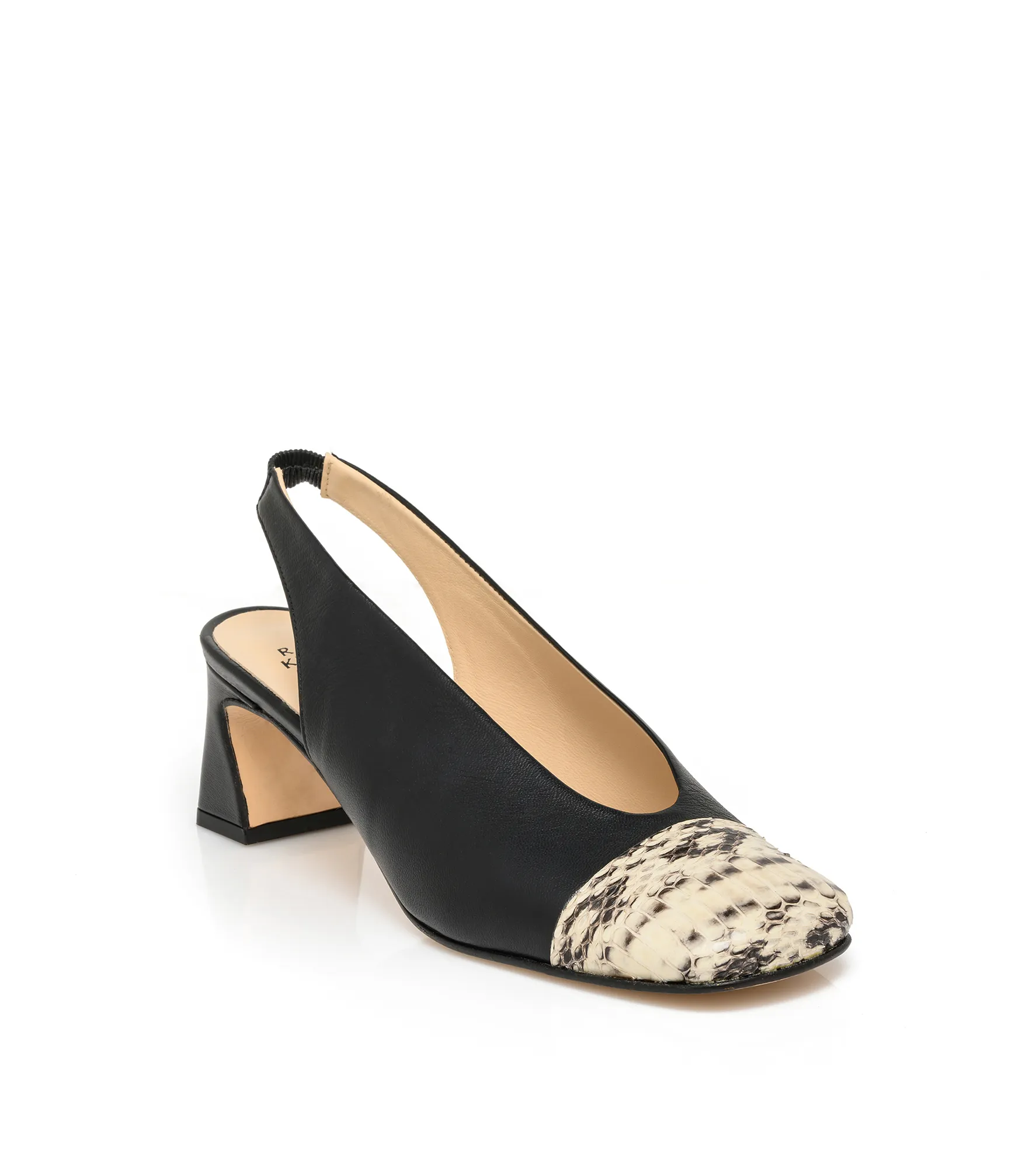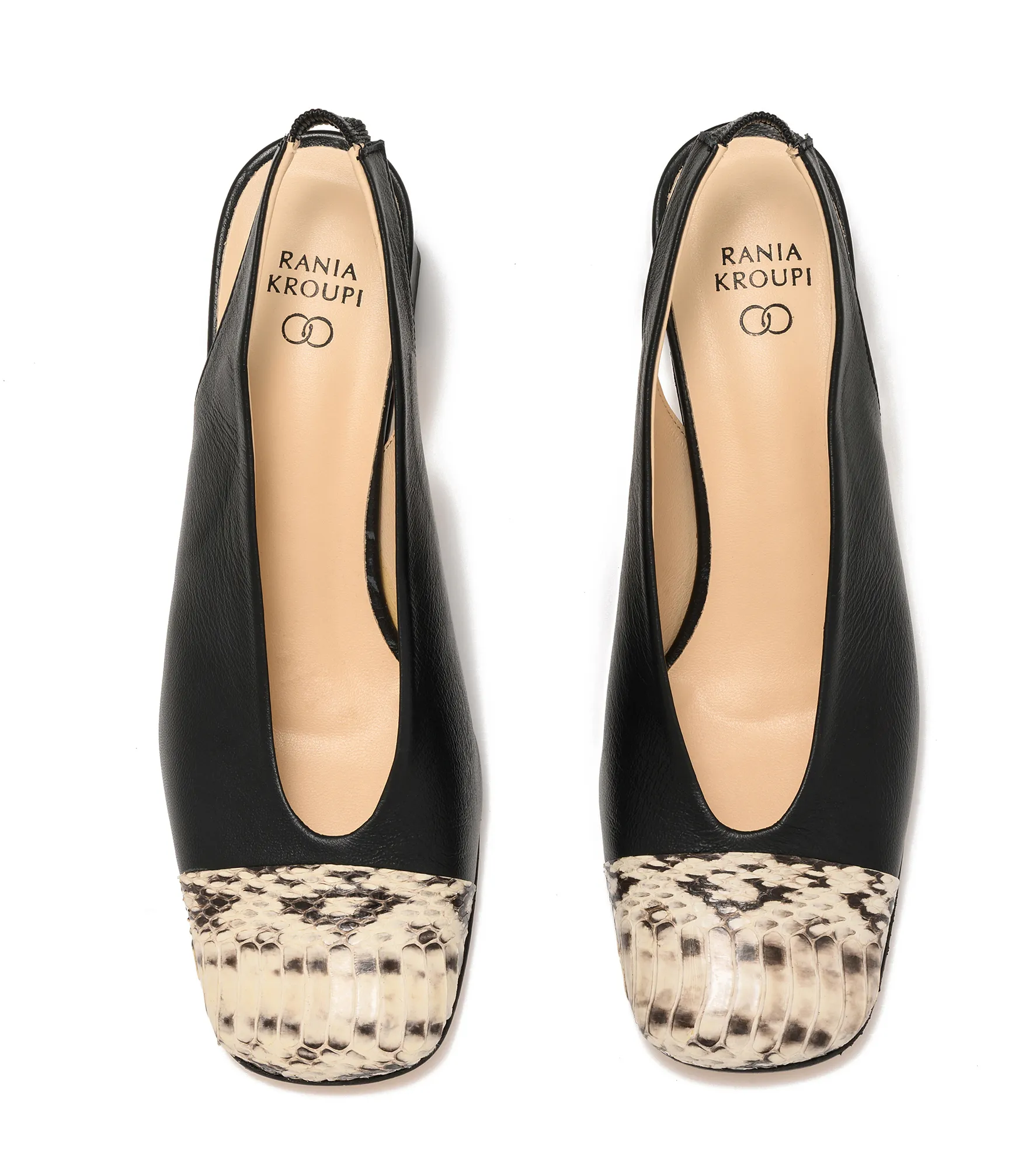 RANIA KROUPI ECLECTIC pumps are what the greek word Eclectic means Made for connoisseurs with a precious essence of well being, recognized by an intense refined personal style picking the best of the best The timeless RANIA KROUPI’s refined style handcrafted in those rounded square toed ECLECTIC pumps. Made in Athens by goat and snake skins and a left leather sole that “whispers” to your heart in ancient Greek “ερως ανικατε μάχαν” that means Love conquers all…. and Dare to conquer all !