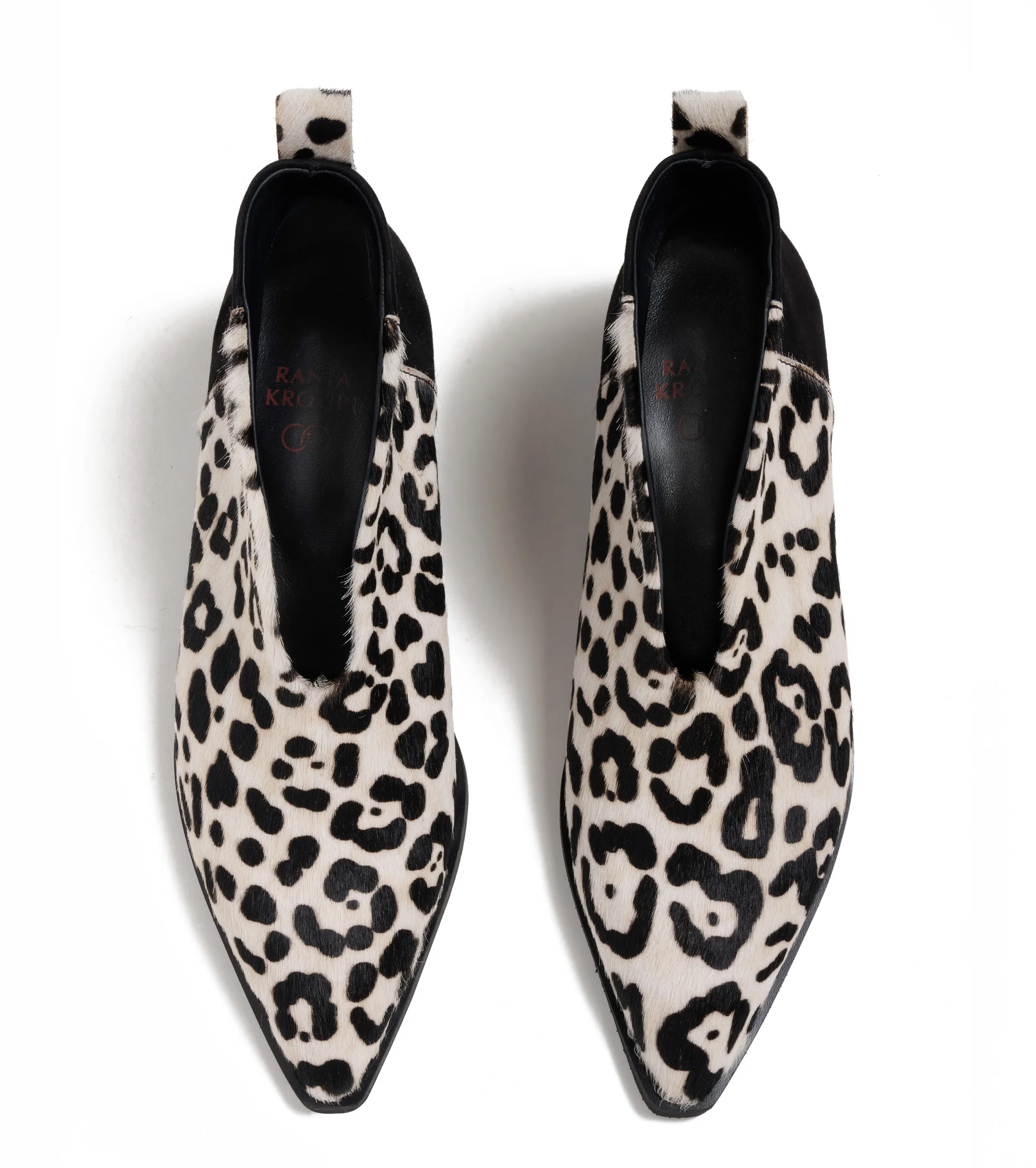 Those beautiful booties with a white’s leopard print on hairy leather, stands out by their architectural design and outstanding form. Made by black suede and print pony skin create a signature style to the woman who wears them. The perfect booties for dynamic, feminine and ultra stylished outfits! Taking off any outfit from office to evening for a versatile and chic look with crop pants, jeans or dresses. Extra bonus: the deep cut design on front side revealing the ankle creates a leg-lengthening effect while are extremely comfy for walking and dancing! Those booties will be the most stylished and comfy you ever had!